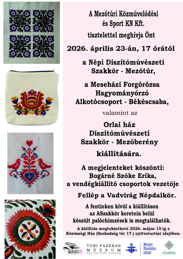 Szíves figyelmükbe ajánljuk a Közösségi Ház hamarosan nyíló kiállítását. A Szakkör programban résztvevő mezőtúri hímzők ezévi munkái is e tárlat keretein belül lesznek láthatók.