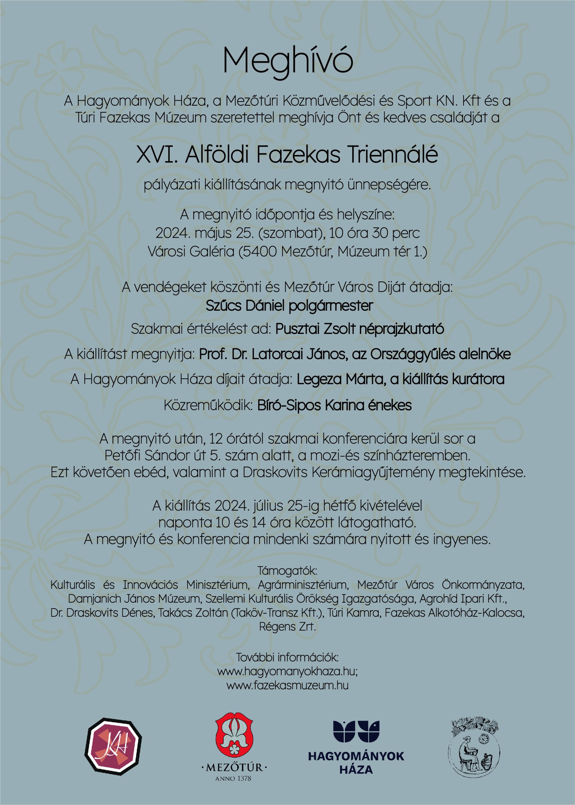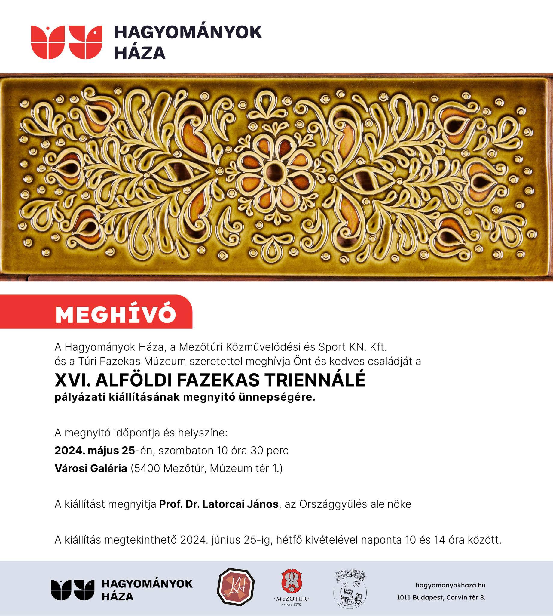 A Hagyományok Háza, a Mezőtúri Közművelődési és Sport KN. Kft és a Túri Fazekas Múzeum együttműködésében kerül megrendezésre a XVI. Alföldi Fazekas Triennálé pályázati kiállításának megnyitó ünnepsége.